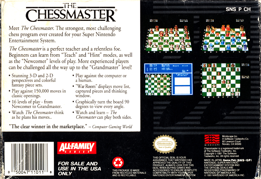 This is a one-player chess game with no beautiful visuals, configurable difficulty, or additional game options, and is possibly the most basic game released on the SNES. It’s not worth your time.